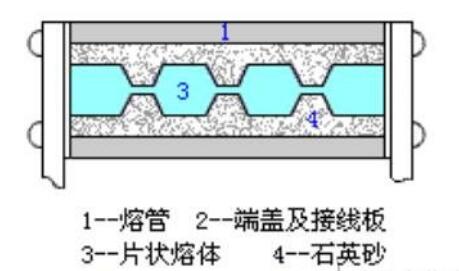 另外一種如下圖所示。熔體裝在有絕緣砂粒填料(如石英砂)的熔管內,在熔體斷開電路產(chǎn)生電弧時,絕緣砂粒可吸收電弧能量,金屬蒸氣能散發(fā)到砂粒的縫隙中,熔體很快冷卻,從而達到滅弧的目的。